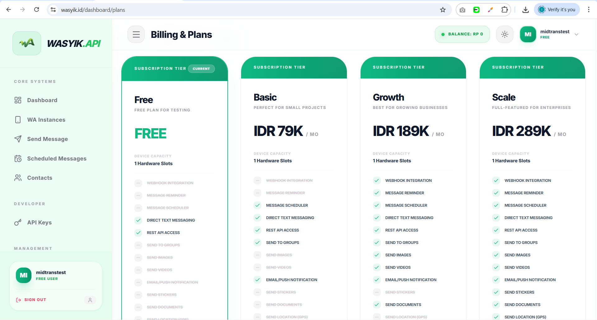 - Paket Free: Cocok untuk uji coba atau bisnis pemula dengan batas 100 pesan per hari.